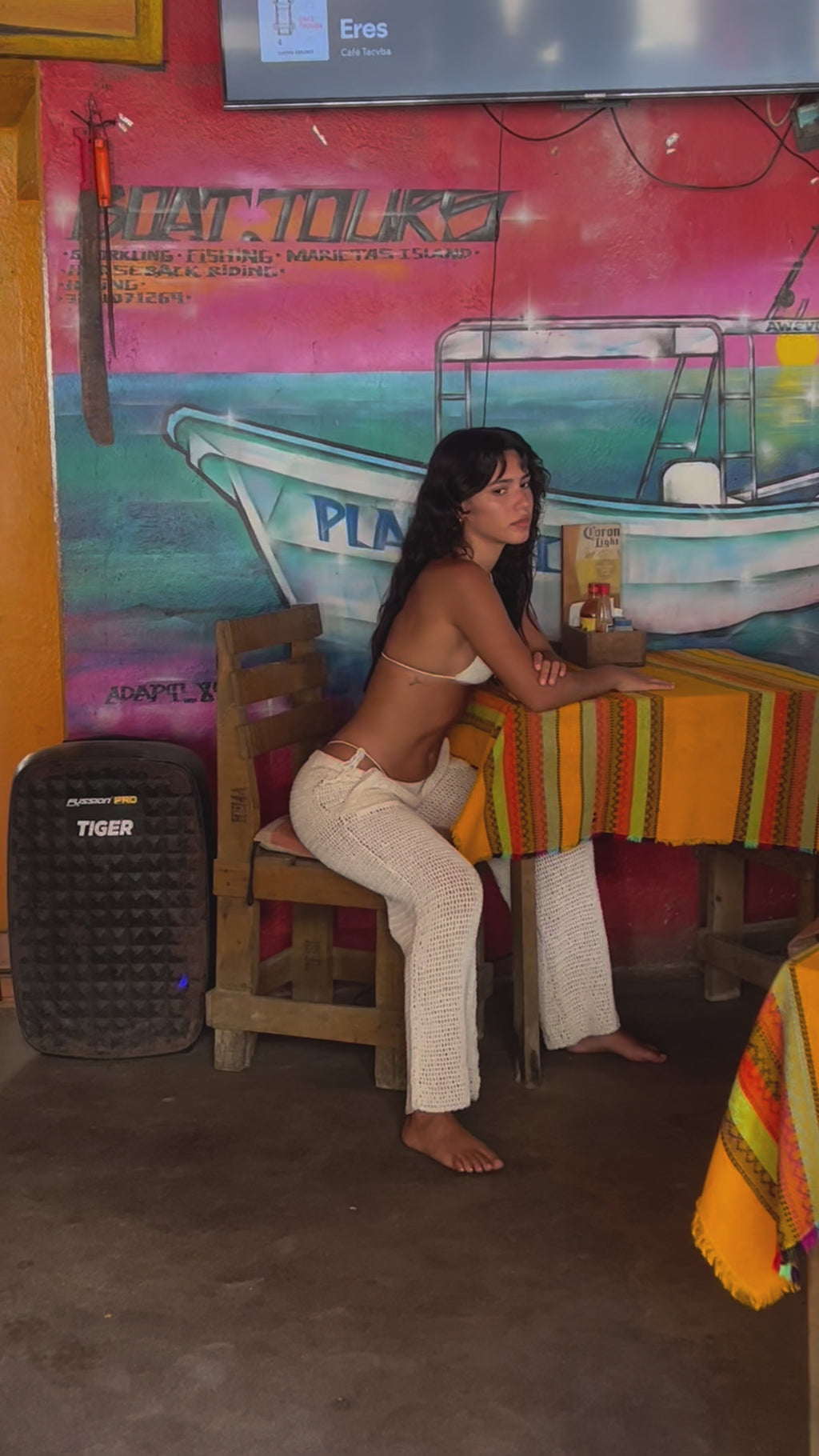 Comfy pants with an elastic waistband and pockets, featuring a slight flare at the leg. Paired with a crop top that ties at the front for a relaxed, loose fit.