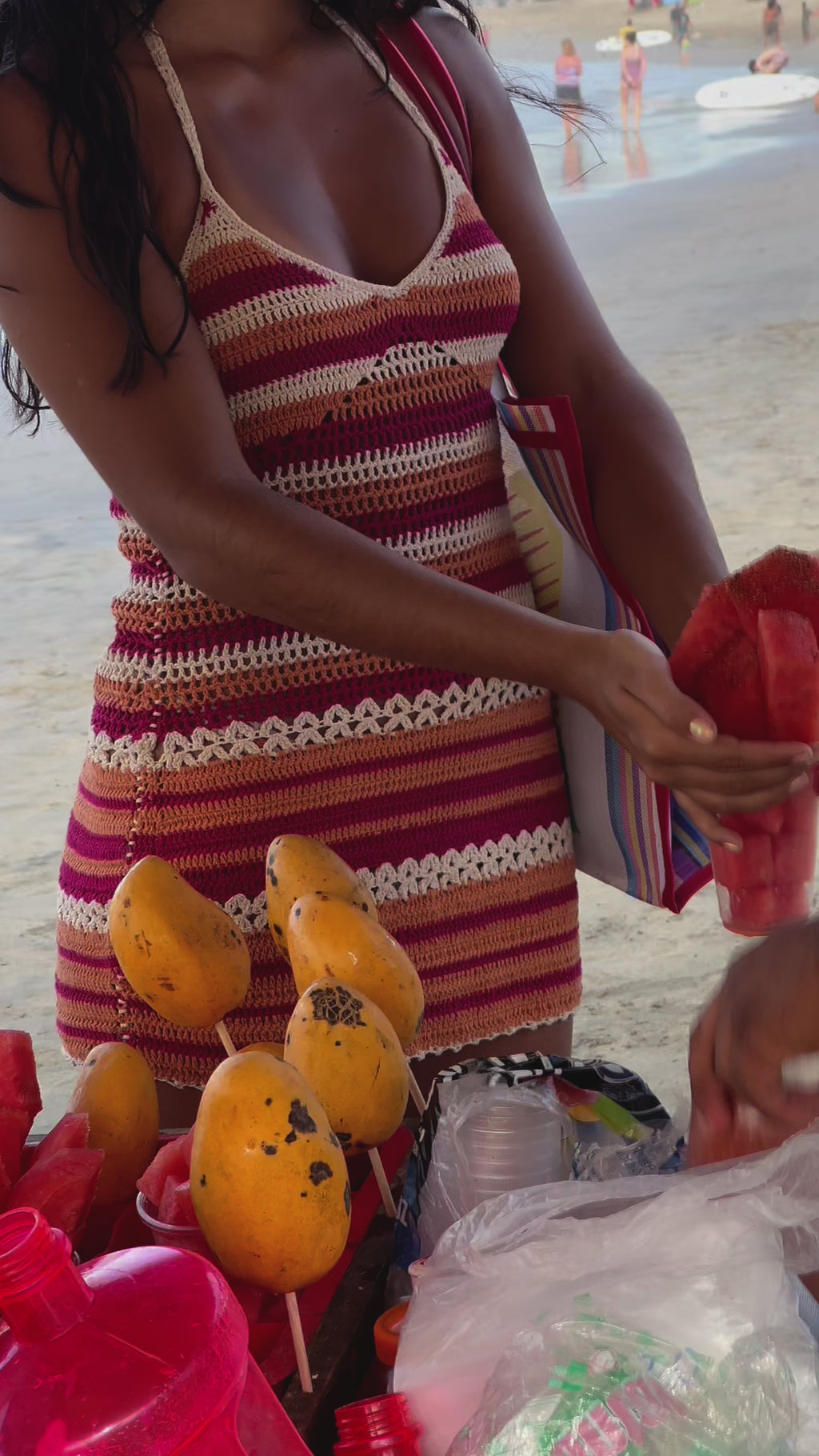Halter neck mini beach dress with a low back, featuring intricate crochet detailing.